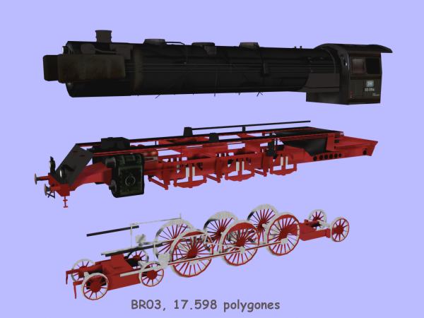 Dieses Modell wurde erstellt unter der Zurhilfenahme von: - Informationsquellen im Internet - Horst J. Obermayer, Dampflokomotiven, Weltbild Verlag ISBN 3-89350-819-8 - "Die Dampflokomotive - Technik und Funktion" Teil 3 von M. Weisbrod und R. Barkhoff, Eisenbahn Journal Archiv, Hermann Merker Verlag GmbH, ISBN 3-922404-06-5 - einem wunderschönen H0 Modell der BR03 der Firma Fleischmann. - Der BR03 im Auto&Technik Museum Speyer - Tips und Ratschlägen aus der TrainSim Scene MadMike`s virtuelle Lokomotiv und Zeppelin Werke :) |