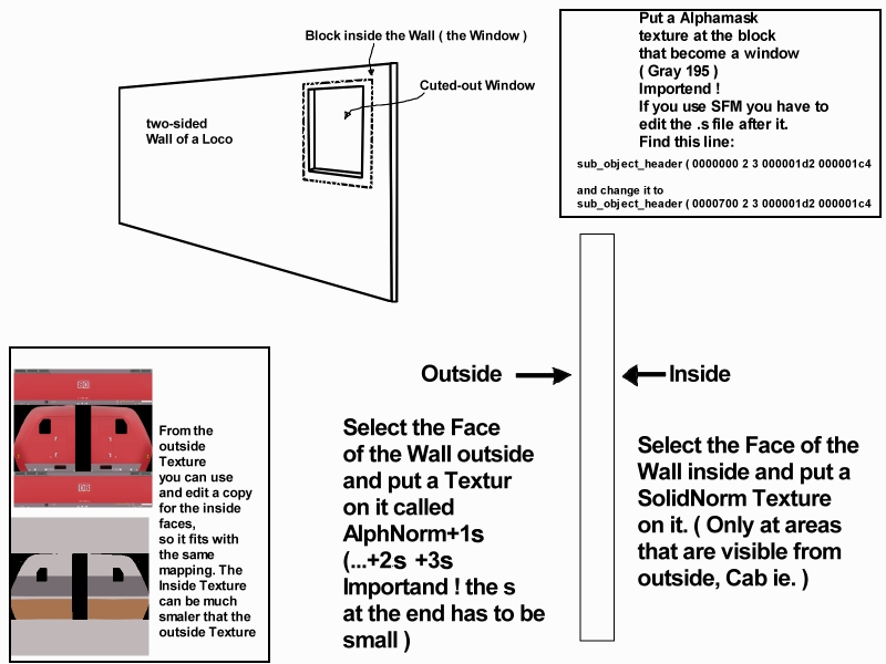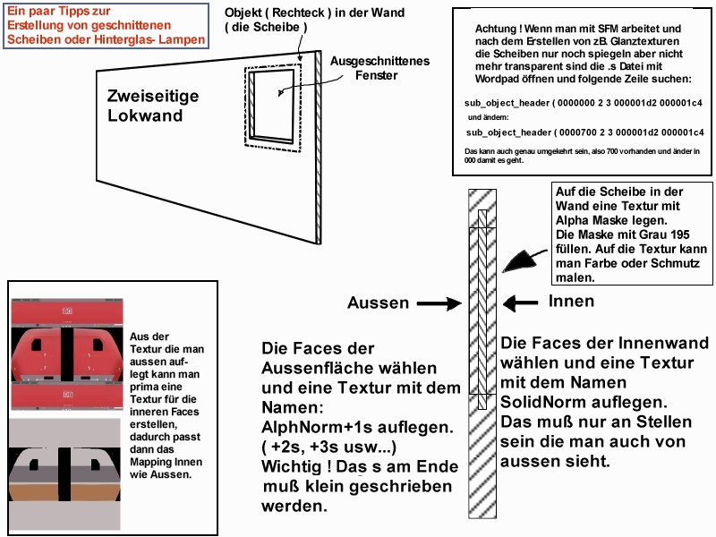 Viele der Lokomotive auf meiner HP besitzen geschnittene Scheiben oder Hinterglas-Lampen. Das hat den Vorteil das man an den Haupttexturen keine Alphamasken benötigt und es dadurch keine Fehlfarben gibt. Hier ein paar Tipps die man bei der Technik beachten sollte.