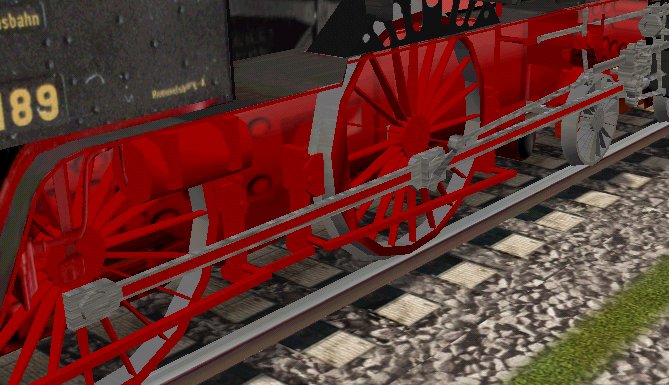 Patchliste - da es sich nach entgültiger Klärung optisch eher um eine S6 handelt, das ganze von den Werten her aber auf einem S3 Fahrwerk steht, laß ich die preußische Bezeichnung mal weg, es handelt sich eher um einen Eigenbau. Um jetzt zurück zur S3 zu gehen müßte Kessel- und Kesselaufbauten geändert werden, der Weg zur S6 hieße Kuppelrad Vergrößerung und Fahrwerksgeometrie verändern. Mal sehen. - es gibt beim Speichenmodell noch einen Farbfehler am ersten Laufrad, das ist entweder komplett grau oder rot, Grau mit roten Flanken ist mit MSTS aus irgendwelchen Gründen nur dort nicht möglich. - die Gegenkurbel der Schwingenstange eiert um ihr Zentrum, wenn ich mal viel Zeit habe animiere ich das Gestänge neu |